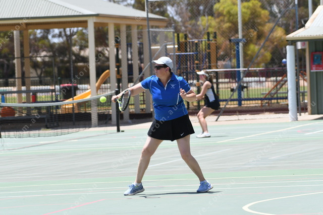 Sharon Gaedtke plays a one-handed backhand shot in her mixed doubles. (529261)