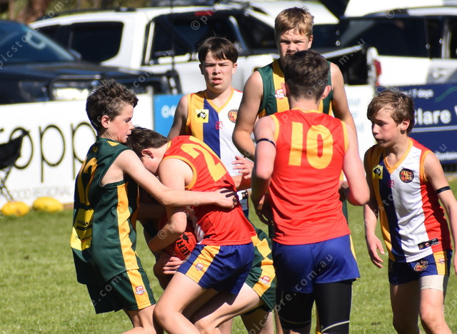 Barossa Light and Gawler’s Freddy Schuster is tied up by North Eastern’s Thomas Scammell (493907)