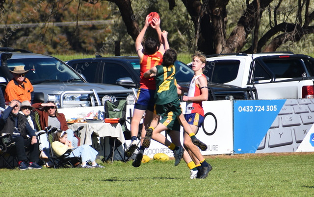 Barossa Light and Gawler’s Hunter Shaw takes the mark against North Eastern’s Thomas Scammell. (493907)