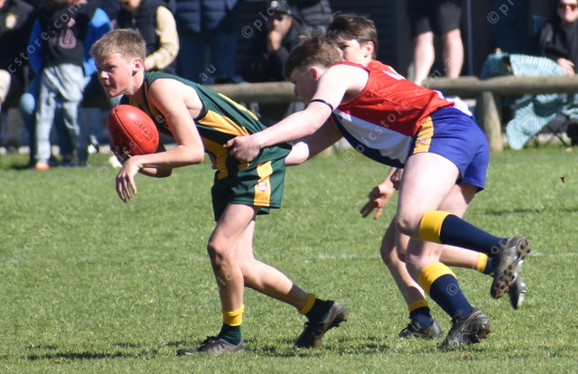North Eastern’s Lucas Ackand tries to shake off Barossa Light and Gawler’s Thomas Applebee. (493907)