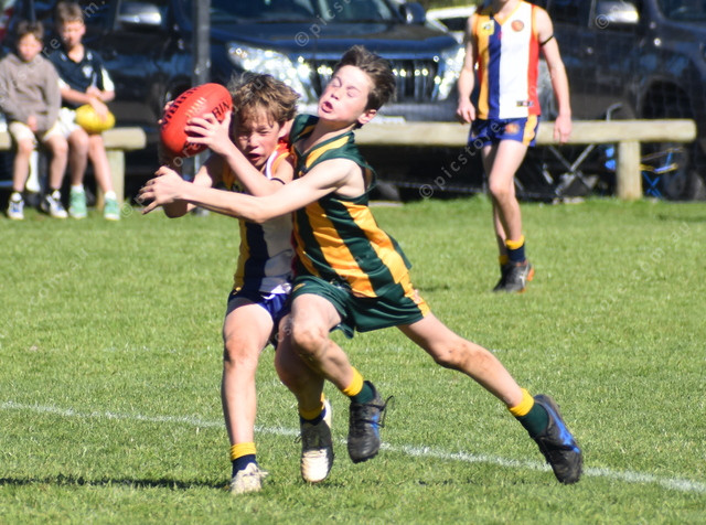 Harvey Clark is crunched by the tackle from North Eastern’s Thomas Scammell. (493907)