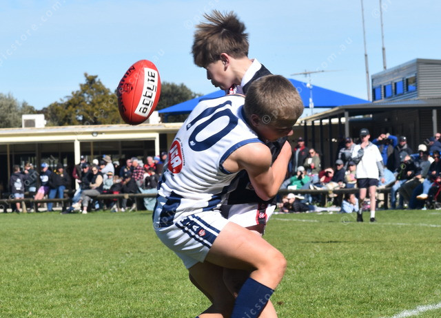 Adelaide Plains’ Kaleb Dudley feels the crunch from this tackle by Northern Areas’ Oscar Arthur. (493907)