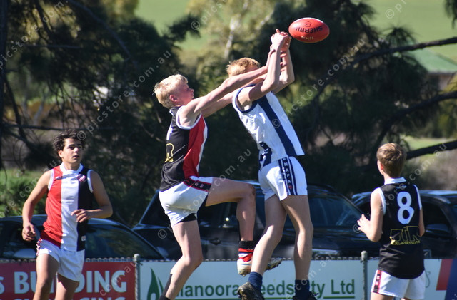 Adelaide Plains’ Riley Koch spoils the mark for Northern Areas’ Tayden Ireland. (493907)