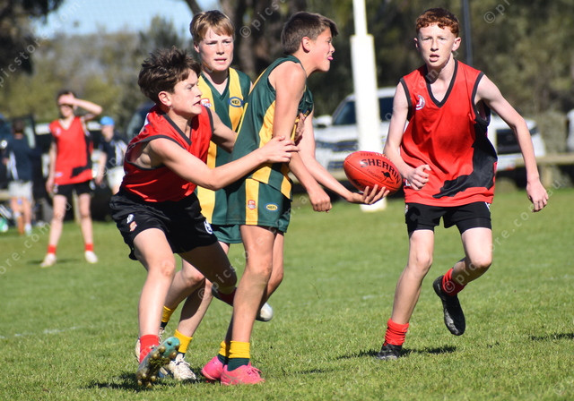 North Eastern’s Sam Hayes tries to handball as he is being tackled by Yorke Peninsula’s Jack Keleher. (493907)