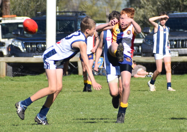 Barossa Light and Gawler’s Parker Mattner kicks the ball as Northern Areas’ Ethan McCarthy attempted the spoil. (493907)