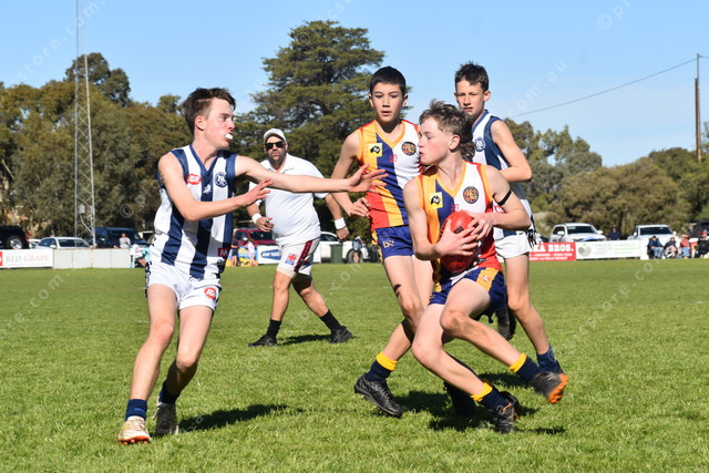 Barossa Light and Gawler’s Riley Stagg about to run into the tackle from Henry Elbourn. (493907)