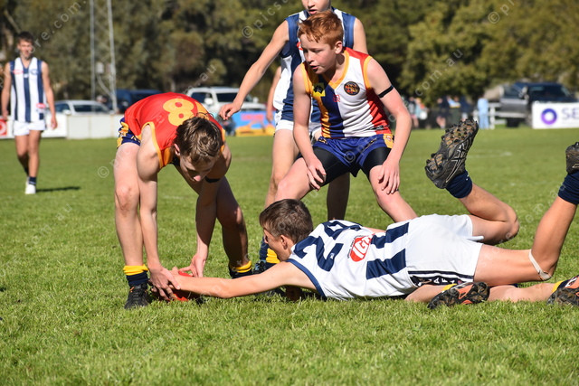 Barossa Light and Gawler’s Riley Stagg and Northern Areas’ Logan Cowin contest the ground ball. (493907)