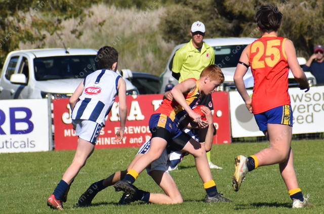 Barossa Light and Gawler’s Parker Mattner is brought down by Northern Areas’ Nash Thomas. (493907)