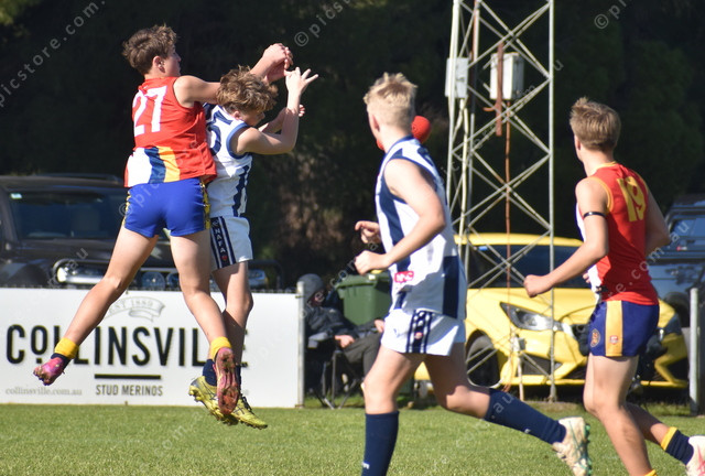Mitchell Semmler punches the ball out of the hands of Northern Areas’ Max Mildren. (493907)