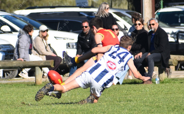 Barossa Light and Gawler’s Doshie Kleemann about to hit the ground hard from this tackle from Northern Areas’ Logan Cowin. (493907)