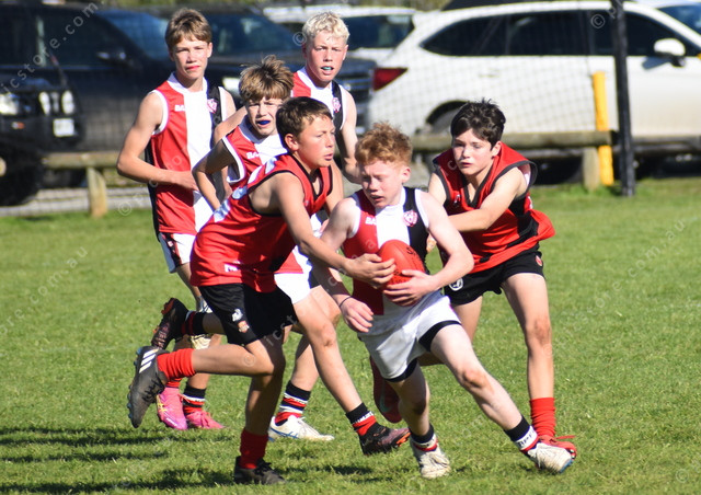 Adelaide Plains’ Luke Howell tries to charge forward as he is grabbed by Yorke Peninsula’s Silas Carty (left) and Patrick Papps. (493907)