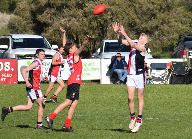 Adelaide Plains’ Riley Koch about to mark against Silas Carty. (493907)