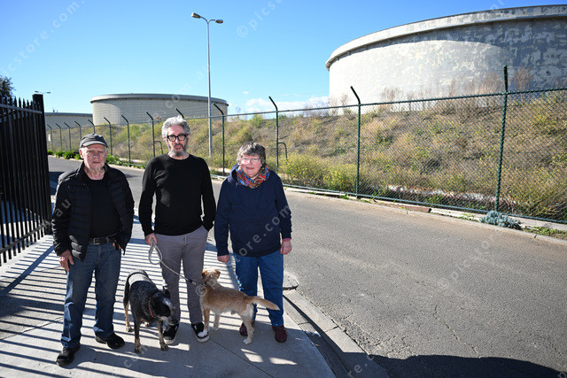 Techno Park Estate in Williamstown, that its fuel tanks located nearby are soon coming down. Pic of happy residents: Bryan Hogan and his dog Mini; John O’Hagan with his dog Zippy, and Helen Sinnema. (Damjan Janevski). 494716_03