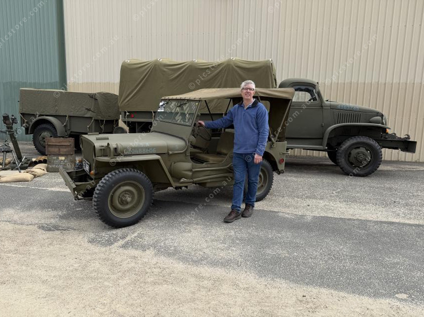 502111_11 John Vichie with some military vehicles; two Willys jeeps and a GMC truck.