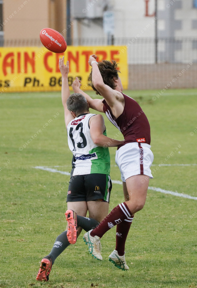 Western Eyre’s Dale Shipard spoils the ball from Great Flinders’ Will Turner. (483450_19)