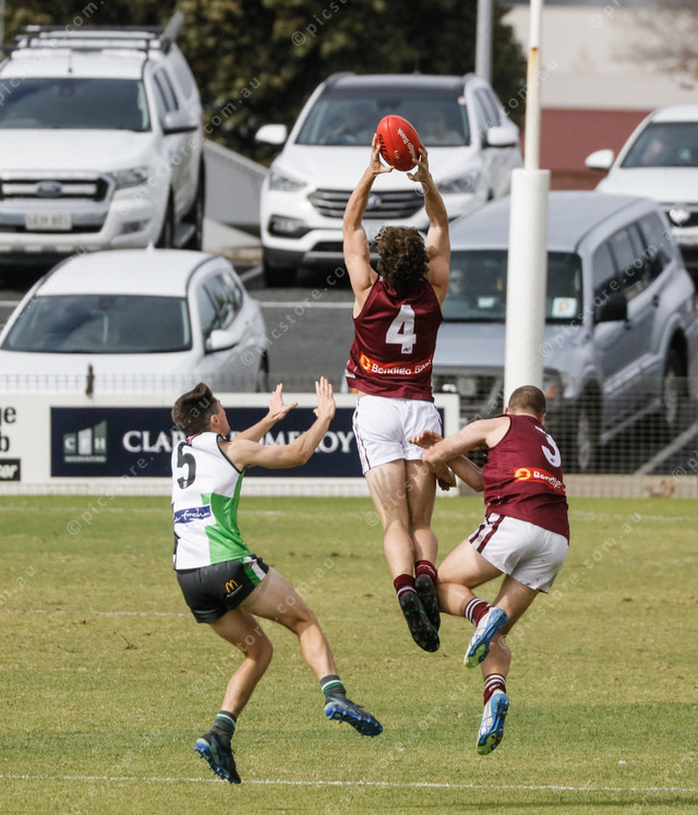 Great Flinders’ Macauley Glover takes a strong mark between teammate Jackson Murphy and Western Eyre’s Zak Bullard. (483450_20)