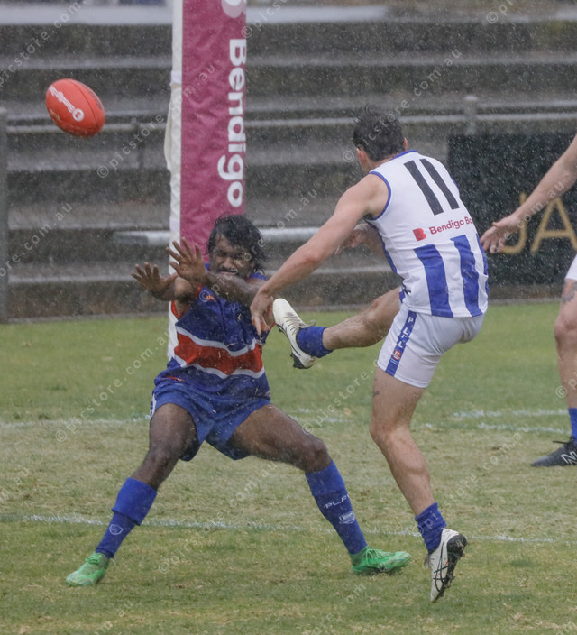Cooper Perham of Lincoln City gets his kick past Lincoln District’s Jermaine Abrahamson-Davey in the pouring rain. (483450_22)
