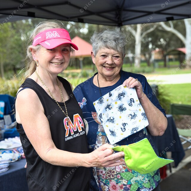 Julie checking out the microwave dish holders with Jan of Sew Wot. (508492_14)