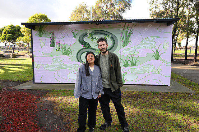 Pic of artists Chanel Tang & Ambrose Rehorek who painted a mural in Deer Park. Photo by Damjan Janevski. 487046_10