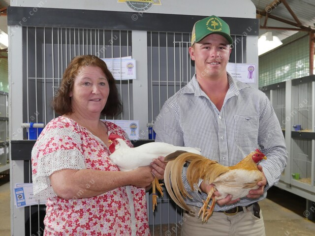 Gabrielle English with her Grand Champion White Leghorn Pullet and Michael English with his Reverse Bird winner Ginger Pile Cockerel. 476031_02
