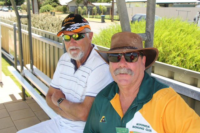 Myponga bowler Mark Collins is with Michael Harris from South Coast Funerals, one of the competition sponsors of the bowling day. (Dee Elferink:529482_02)