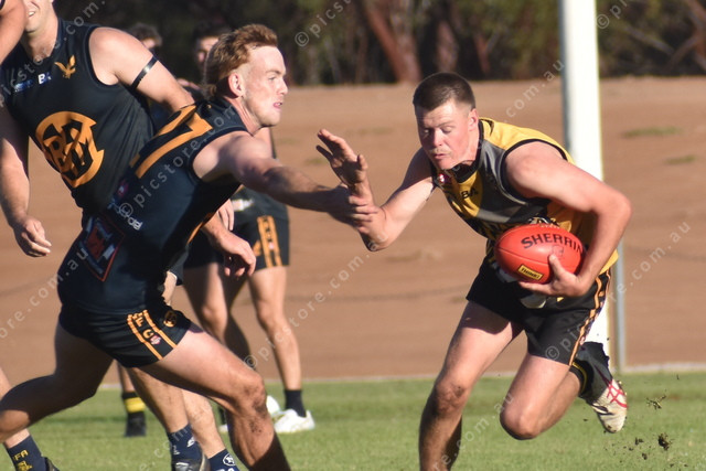 Southern Flinders’ Ben Flowers shrugs off the challenge. (Jarrad Delaney: 474315)