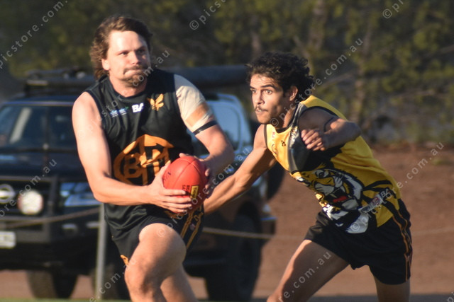 Broughton-Mundoora’s Saxon Tod is pursued by Southern Flinders’ Ronald Nash. (474315)
