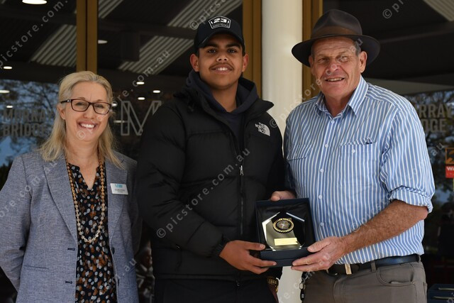 Rural City of Murray Bridge mayor Wayne Thorley (right) and deputy mayor Airlie Keen (left) presented Josiah Angie with the Sportsperson of the Year Award.
