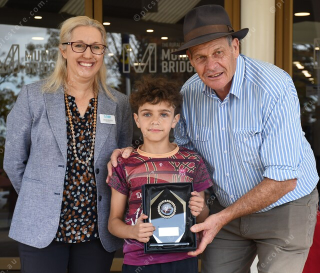 Rural City of Murray Bridge mayor Wayne Thorley (right) and deputy mayor Airlie Keen (left) presented Andre Kropinyeri with the Male Junior Encouragement Award.