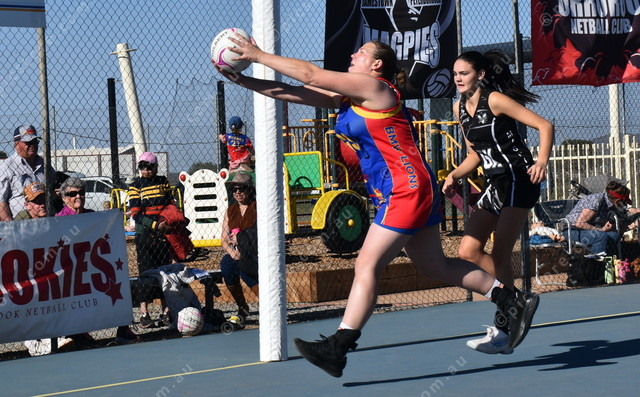 Chloe Clarke reels in the goal circle feed ahead of Iysha Cunningham. (502016)