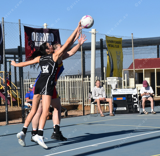 Iysha Cunningham gets first hands to the ball ahead of BMW’s Chloe Clarke. (502016)