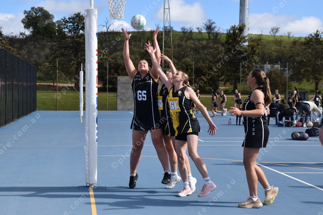 Magpie Jess Robinson reaches up for the lob as Tigers Kaitlin Davidson and Ella Palmer contest. (494266)