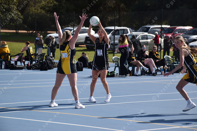 Maddi Pryor searches for the right option as Isabella Arthur defends. (494266)