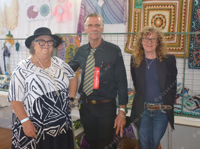 Cr Erkins, Des Schloss and Sue Hunt enjoy what’s on display at the pavilion. 471898_05