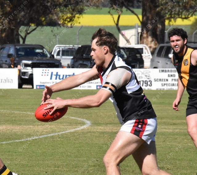 Saint Brodie Launer pumping the footy forward in the A Grade prelim final. (503318)