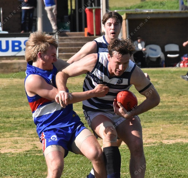 Ram Malachi Lloyd gets hold of Will Pratt at Burra on Saturday. (498170)