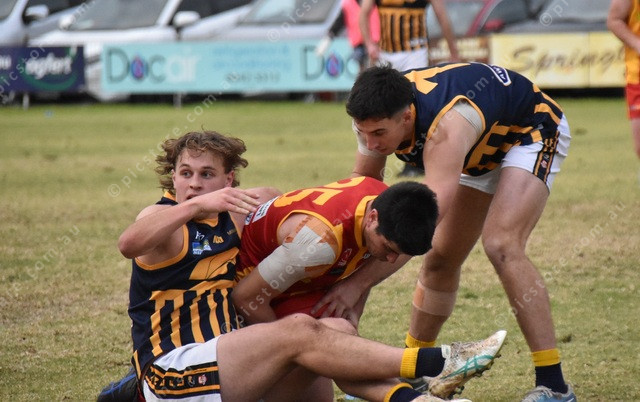 Eagles Ben Miles and Taaj Nicholls nab Emmett Cashel. (487184)