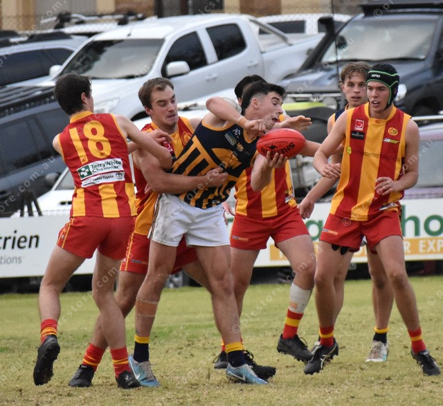 Taaj Nicholls surrounded by Roosters at Clare. (487184)