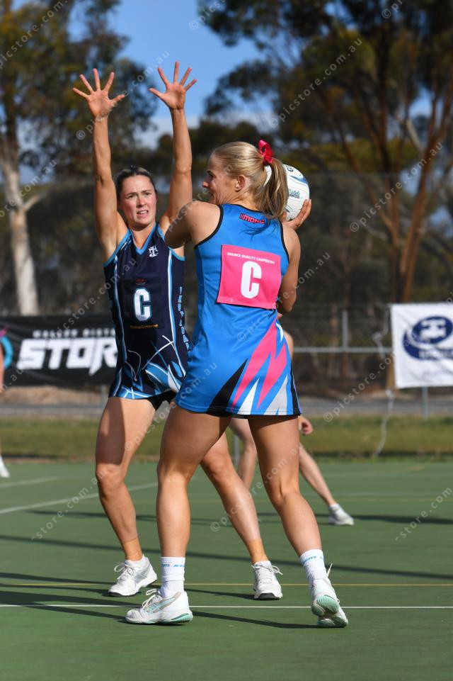 Abby Taverner, Imperials, defends Chelsea Burns, Mallee Storm, during the A Grade qualifying final in Karoonda on Saturday.