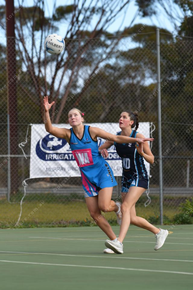 Jess Kerr, Mallee Storm, and Lily Weckert, Imperials, go for the ball during the A Grade qualifying final. (William Bailey: 500668)