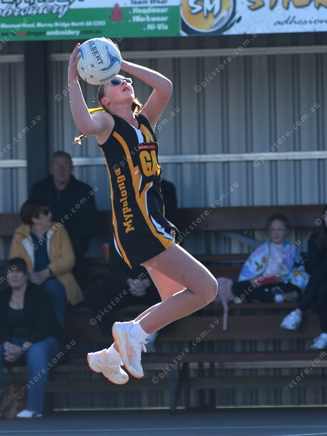 Makayla Baker, Mypolonga, jumps for a catch during the Intermediate 3 grand final against Mannum. (William Bailey: 503967)