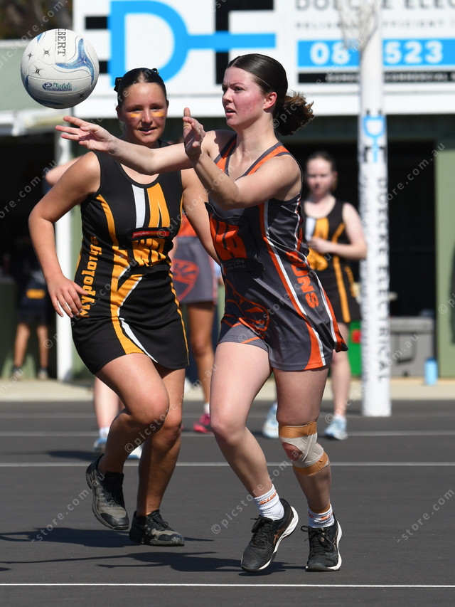 Ava Hagger, Mypolonga and Beth Philbey, Southern Mallee Suns, make a run for the ball in the Intermediate 2 grand final. (William Bailey: 503967)