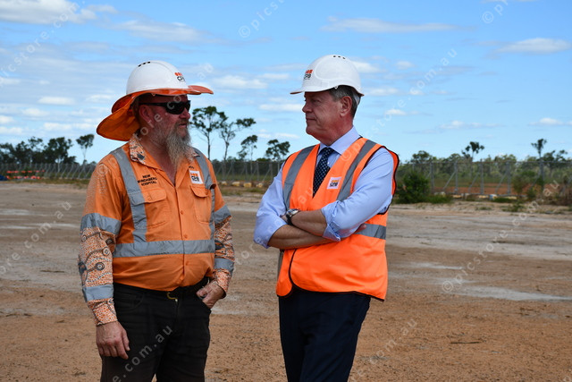 Health Minister Tim Nicholls speaks with a CPB Contractors worker at the new Bundaberg Hospital site.