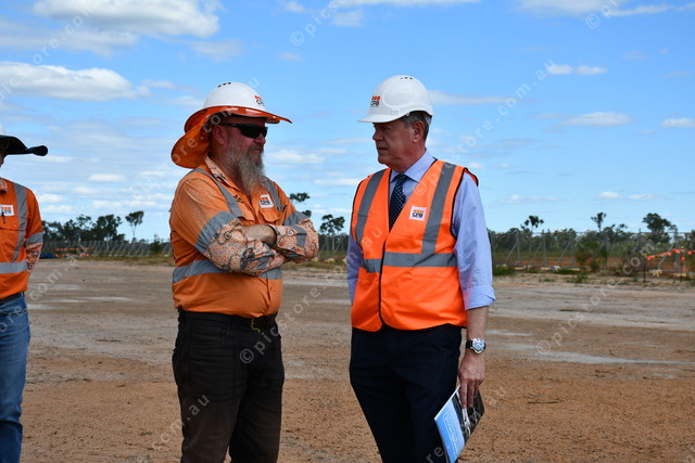 Health Minister Tim Nicholls speaks with a CPB Contractors worker at the new Bundaberg Hospital site.