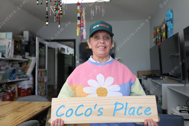 Lovely Nerida Kerr, participant, with her art work CoCo’s Place. from Hamilton.