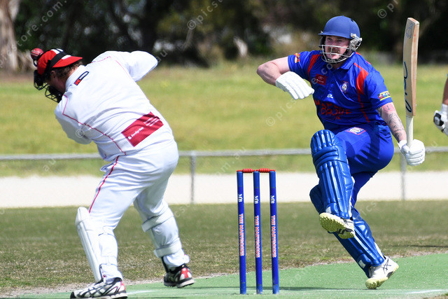 It’s all happening! Wicket keeper Paul Filippone seems to have the ball balancing on his head as Jarratt Eastburn tries to keep his balance 511075_08