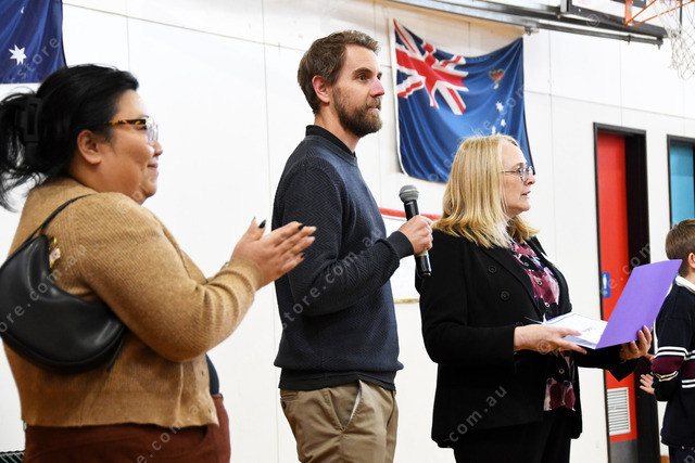 Amy Lines and Ben Nobelius from Nobelius Land Surveyors with school principal Katrina Stewart announce the winer 520513_01