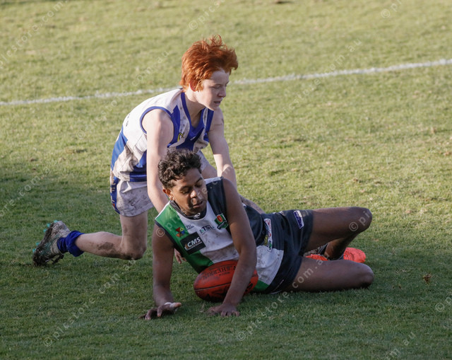 Lincoln City’s Logan Rawling tackles Western Eyre’s Jadell Milera. (483455_16)