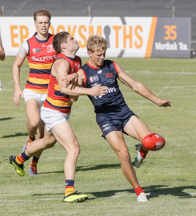 Jack Heard gets boot to ball for Norwood as Adelaide’s Harry Schoenberg tackles. (Jack Davies: 476426_05)