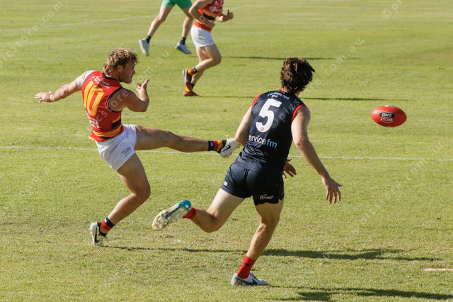 Adelaide’s Luke Pedlar gets his kick away from Norwood’s Pierce Seymour. (Jack Davies: 476426_07)